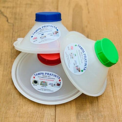 A Tampa Pratinta foi desenvolvida e devidamente Patenteada, para latas de 3,6 litros e 18 Litros, nosso modelo serve para as maiores marcas de tinta do mercado, haja visto que existem fabricas de latas que não seguem padrões de tamanho.